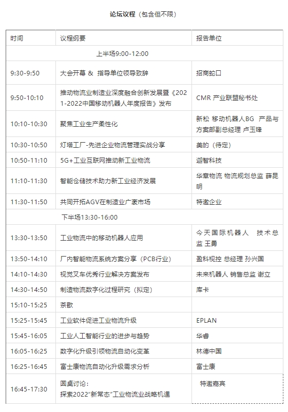 招商蛇口產(chǎn)業(yè)園區(qū)事業(yè)部ITES 深圳國際工業(yè)制造技術(shù)展覽會世界經(jīng)濟論壇大中華先進制造(燈塔工廠)深圳市服貿(mào)服務貿(mào)易協(xié)會上游硬件設(shè)備:貨物包裝、智能立體倉庫、AGV自動搬運機器人、AMR自主移動機器人、無人配送機器人、碼垛機器人、RFID自動識別設(shè)備、堆垛機、輸送機、分揀機、無人叉車、無人機、智能快遞柜等;中游軟件系統(tǒng):物流管理信息系統(tǒng)(LMIS)、智能倉庫管理系統(tǒng)(SWMS)、倉庫控制系統(tǒng)(WCS)、集成倉儲管理系統(tǒng)(IWMS)、制造執(zhí)行系統(tǒng)(MES)等;下游應用行業(yè):醫(yī)藥、汽車、新能源、鋰電池、3C、電子、零售、電商、冷鏈等。其他:物流周邊設(shè)備及配件、自動化包裝設(shè)備及材料、運動控制技術(shù)及產(chǎn)品、氣動液壓執(zhí)行元件、齒輪傳動/減速機、軸承及傳動聯(lián)結(jié)件、產(chǎn)業(yè)園區(qū)等