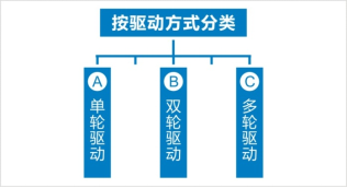 按照驅(qū)動方式分,可分為單輪驅(qū)動、雙輪驅(qū)動、多輪驅(qū)動。