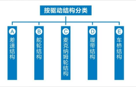 按驅(qū)動結(jié)構(gòu)分,可分為差速結(jié)構(gòu)、舵輪結(jié)構(gòu)、麥克納姆輪型結(jié)構(gòu)、履帶結(jié)構(gòu)、車橋結(jié)構(gòu)等。
